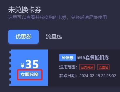 抽奖获取到的 优惠券 流量包 ,购买的 抵扣券礼包 均需在福利中心下方选择 未兑换卡券 查看兑换